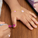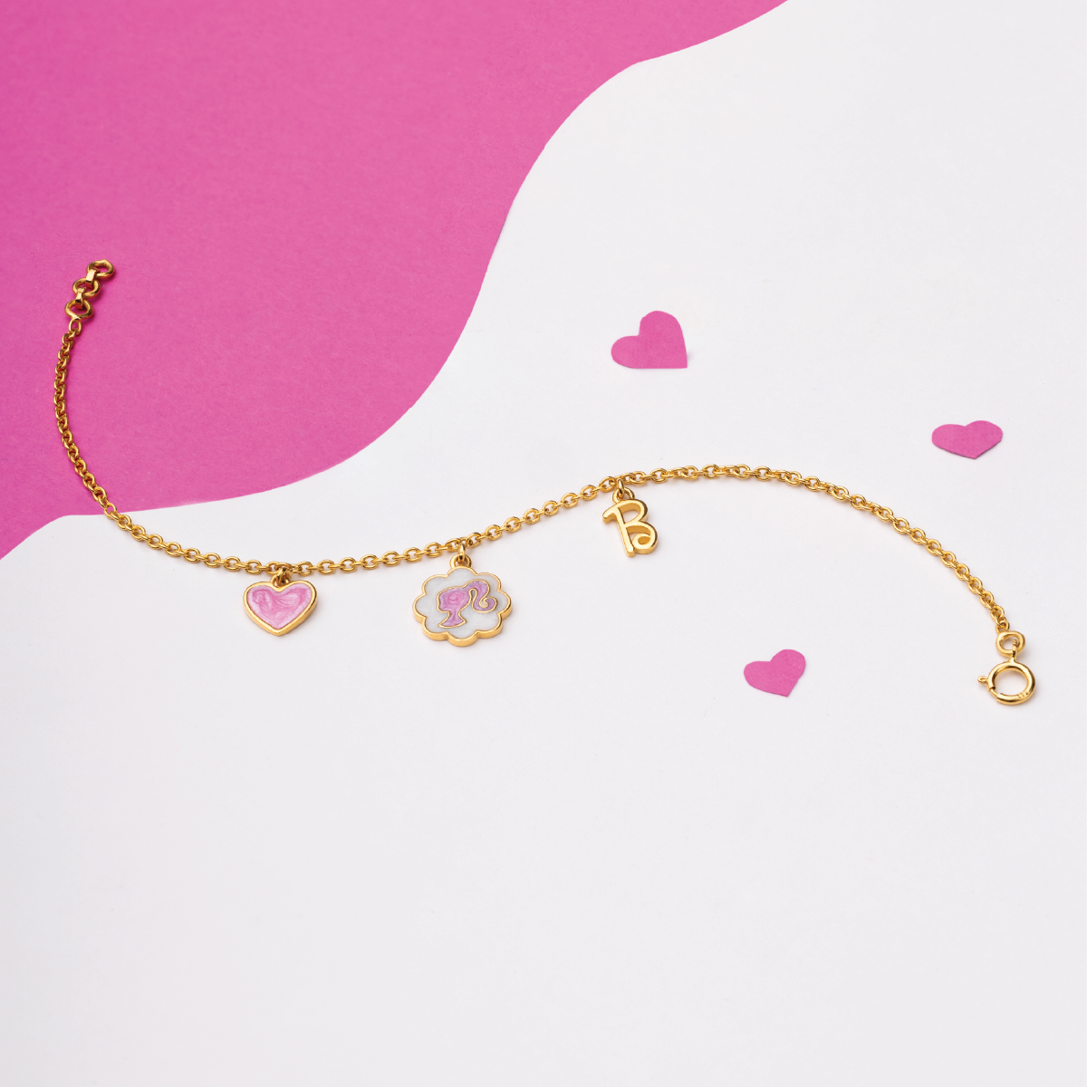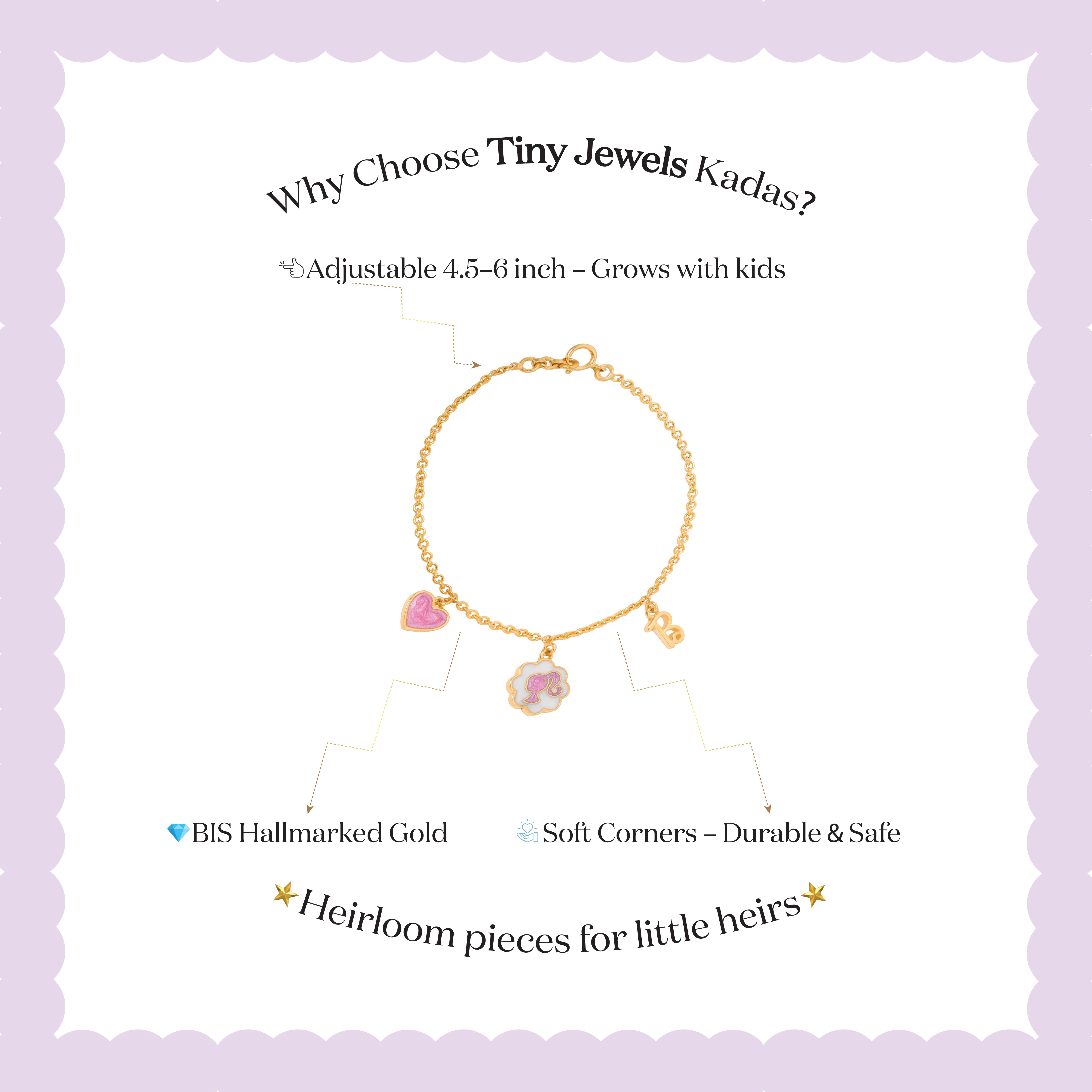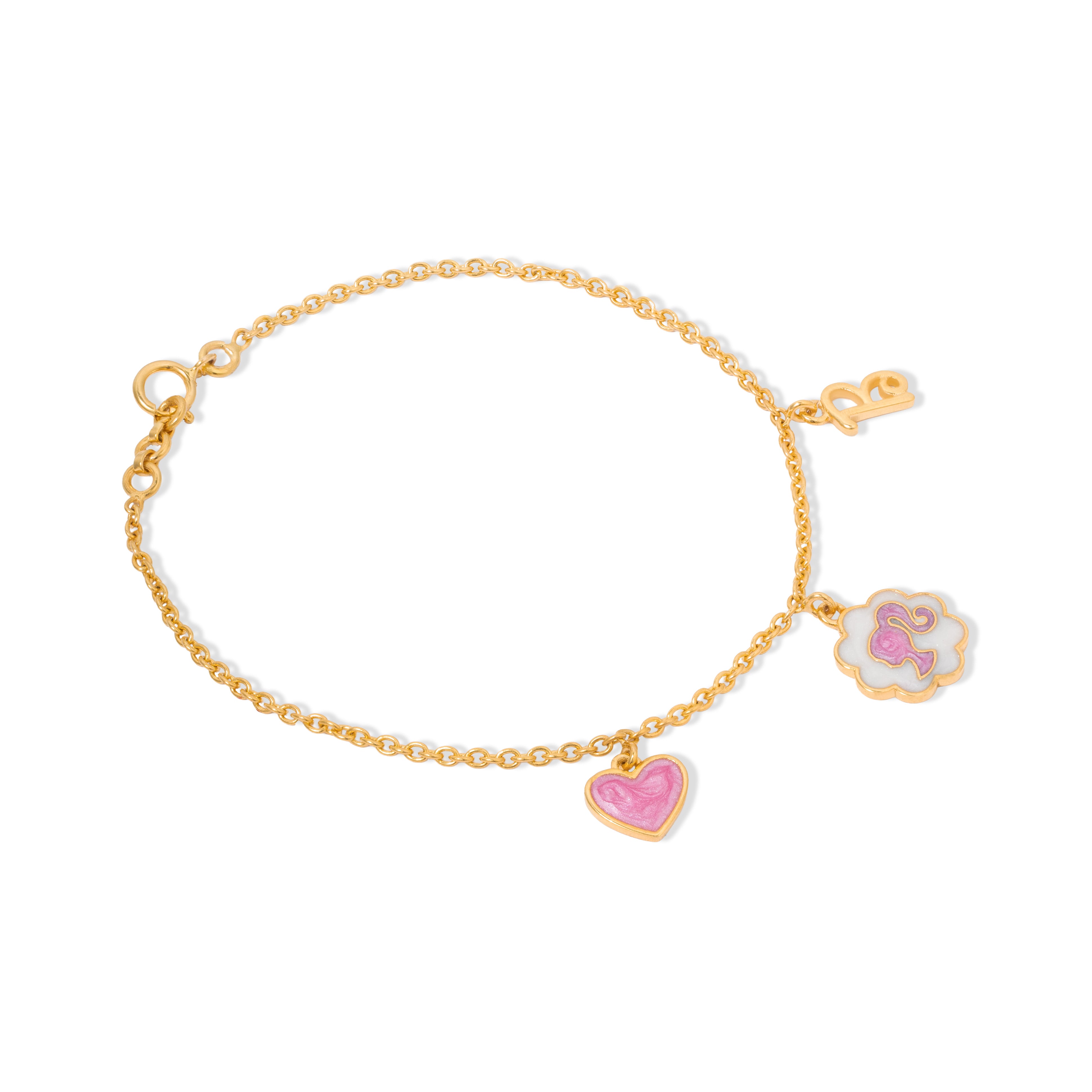 Let imagination shine with our Iconic Barbie Bracelet, twinkling in solid gold with Barbie charms. Made with hypoallergenic gold for fashion forward comfort, this charming piece makes your little one feel a sense of wonder every time every time this piece dangles around their little wrist.