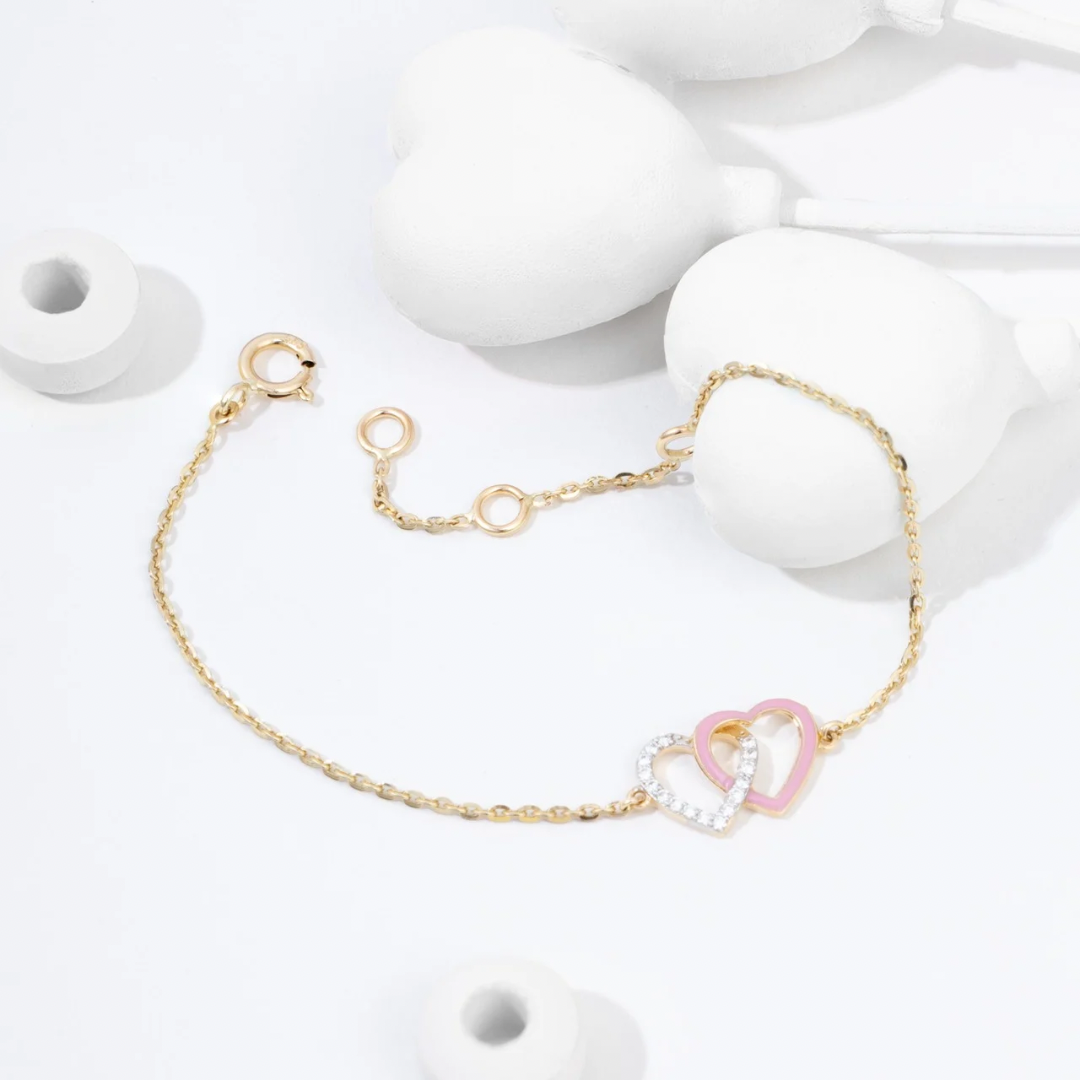 Two hearts, double the charm! This Pop Bracelet features a sweet pair of joined hearts, one gleaming with colorful enamel, the other sparkling with a diamond. Gentle on little wrists, it’s a joyful little duo made to brighten every tiny adventure.