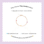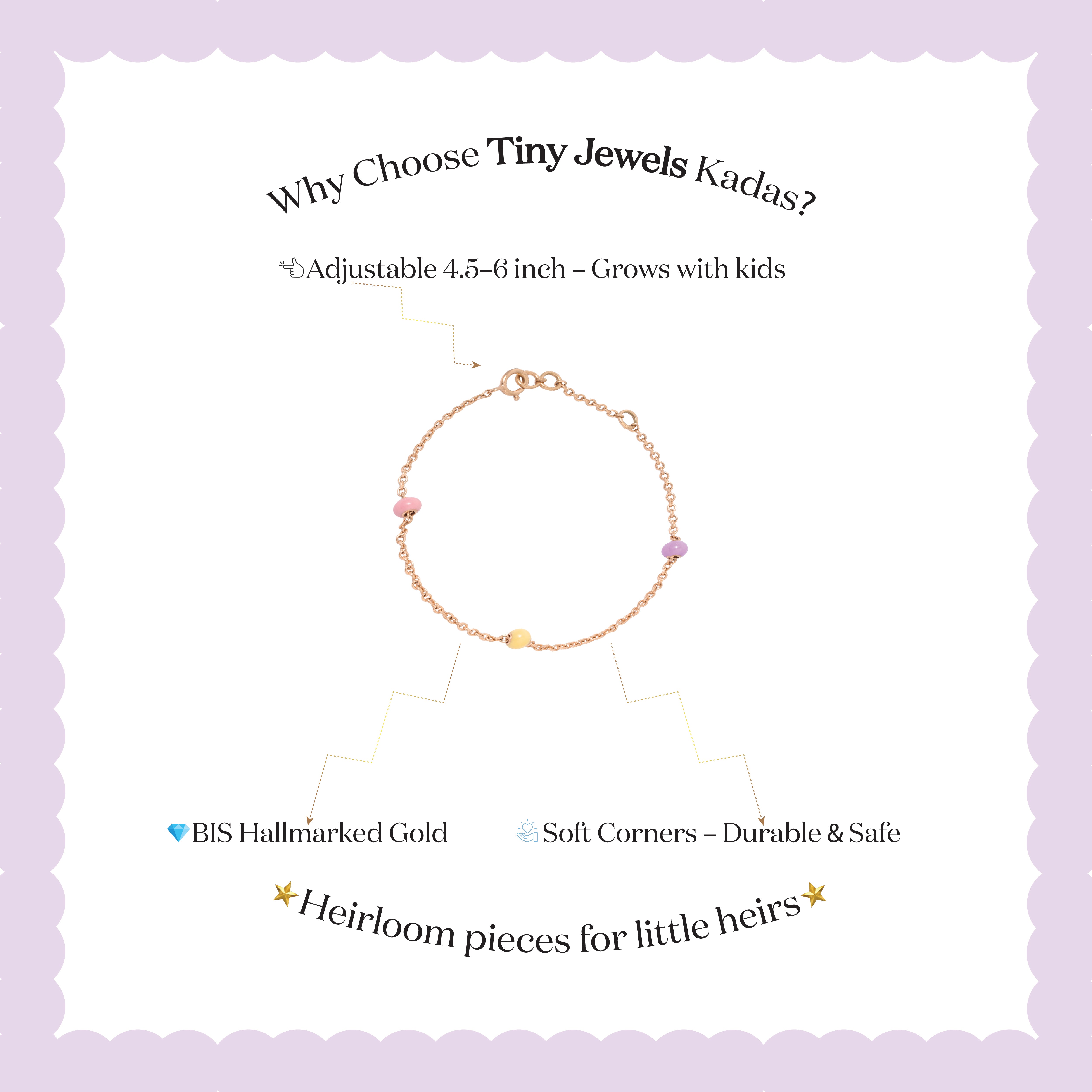 Enjoy calm color with our Pastel Charm Bracelet, set with soft enamel balls in solid gold. This piece is made with hypoallergenic gold and is easy to wear, With a fun design and poppy pastel colours it is perfect for every style. Add more colour to your little one’s childhood with this timeless gift!