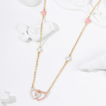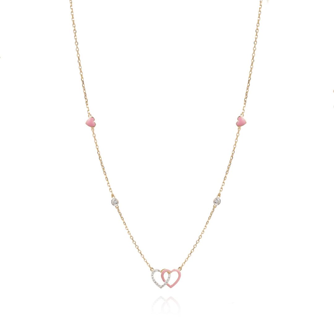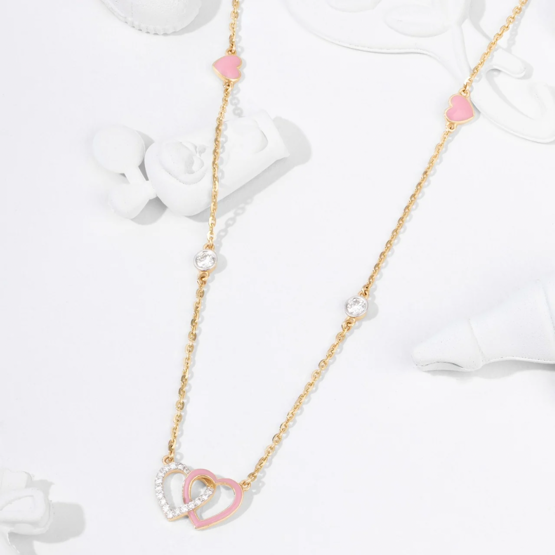 Two hearts meeting in a sparkle-filled hug! One shines with cheerful enamel, the other twinkles with a tiny diamond, creating a tiny world of love and laughter. Made for little adventurers, this chain skips along with giggles, spins, and sunny smiles, turning every moment into a little celebration.