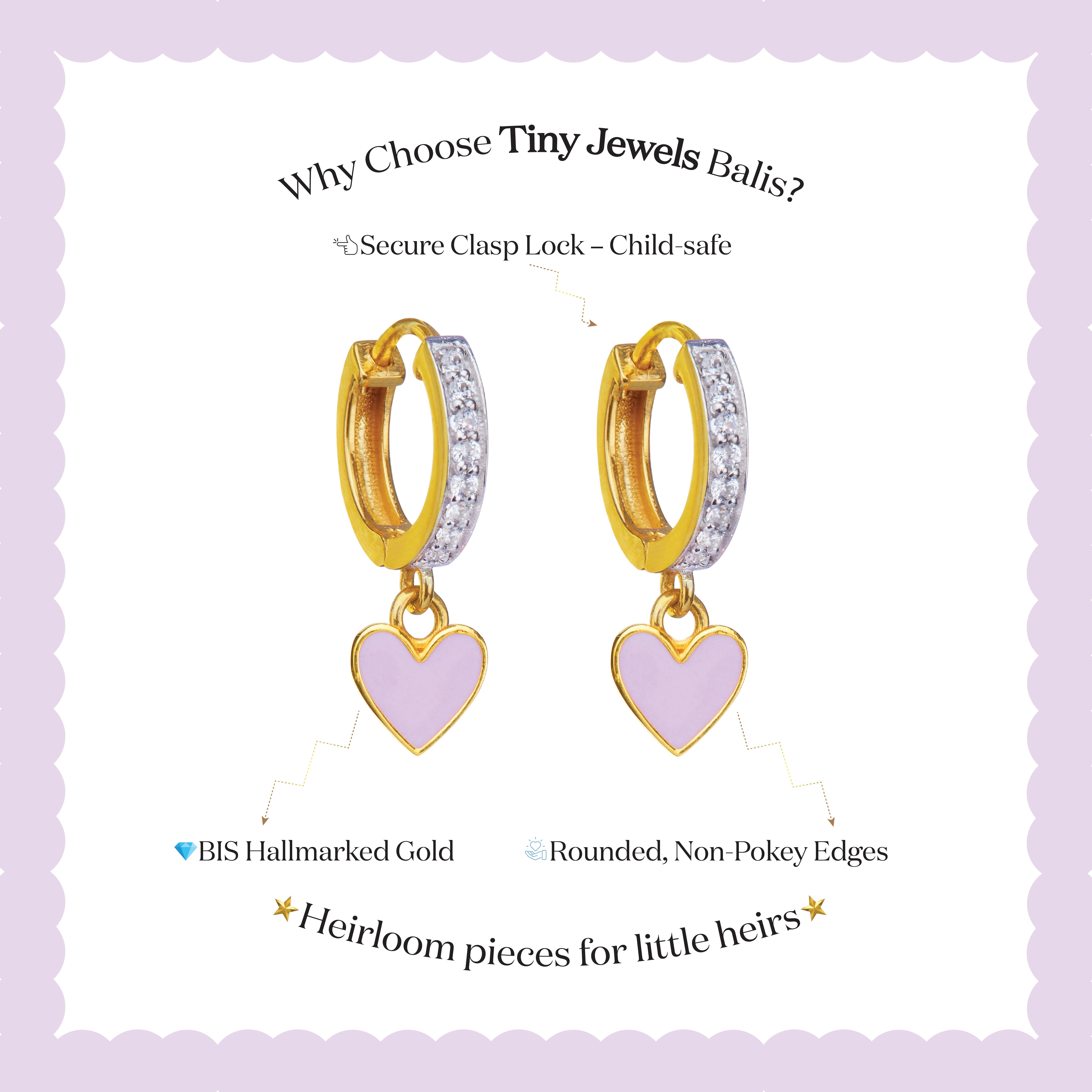 Gift love and care to your little one with our Lilac Love Bali, meticulously made in solid gold. The gentle heart shines with affection, friendship, and trust. Perfect for sensitive ears, these are crafted with durable hypoallergenic material which is safe for everyday wear. These balis celebrate the tender hearts of childhood. Give your tiny ones these balis and a tight hug!
