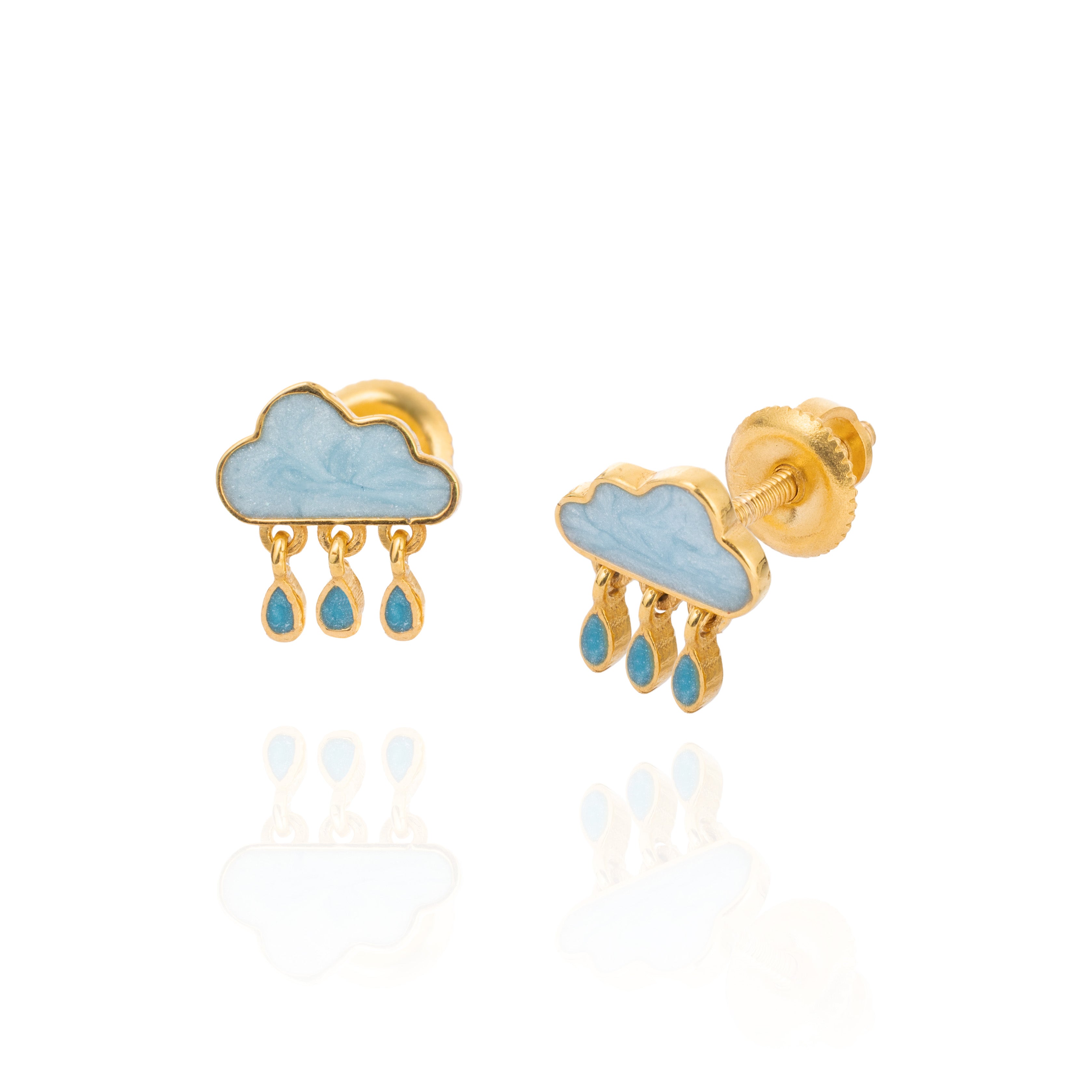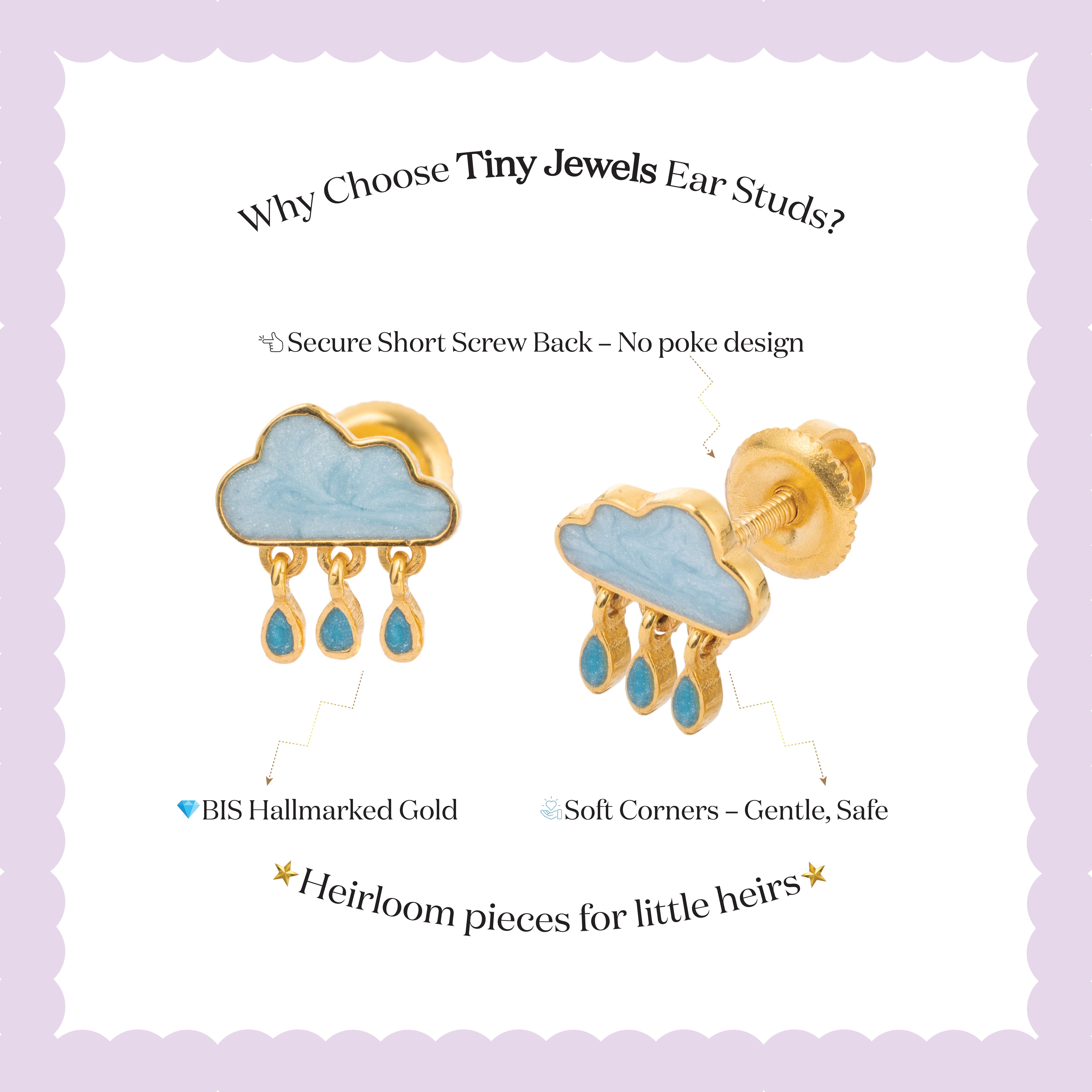 Let your young dreamer float on soft clouds with our Breezy Clouds Studs in Solid gold. These airy pieces weave gentle blue hues with golden gleam. Crafted for delicate comfort and lasting wear, these Hypoallergenic pieces are safe for your little one. Ready to watch them catch the breeze of wonder?