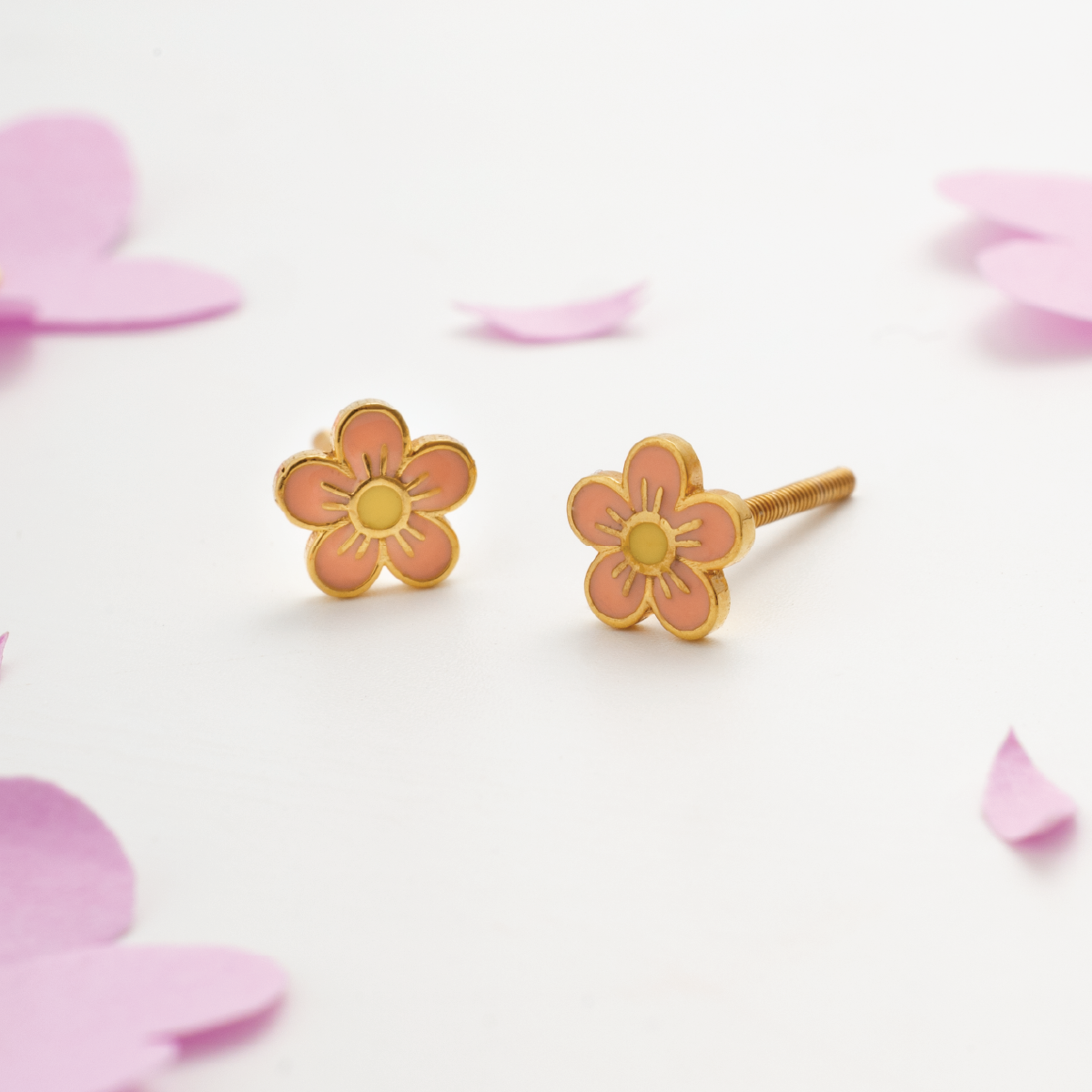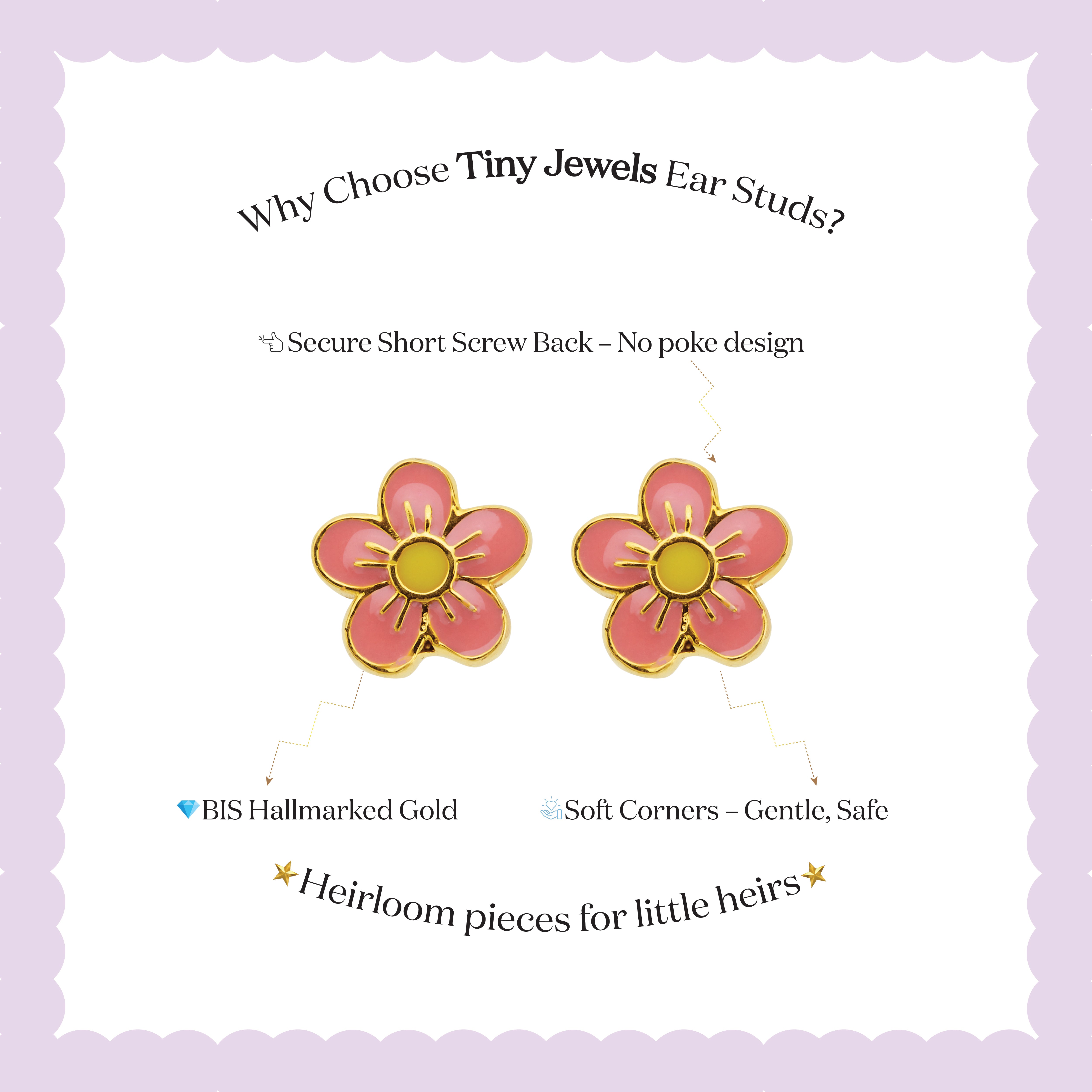 Wrap your precious little one’s day in the warmth of dawn with our delicate Floral Coral Studs in solid gold. These soft, coral-hued blossoms bloom with grace and gentle comfort. Made for everyday wear, these have been designed using hypoallergenic material which is safe for a child’s soft skin. Perfect for adding a sparkle to little moments, these studs have a tender charm. Ready to see your loved child blossom with light?