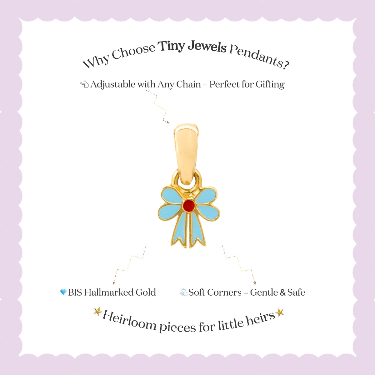 Tiny Jewels gold pendant with blue bow design on a white card with text about Tiny Jewels Pendants.