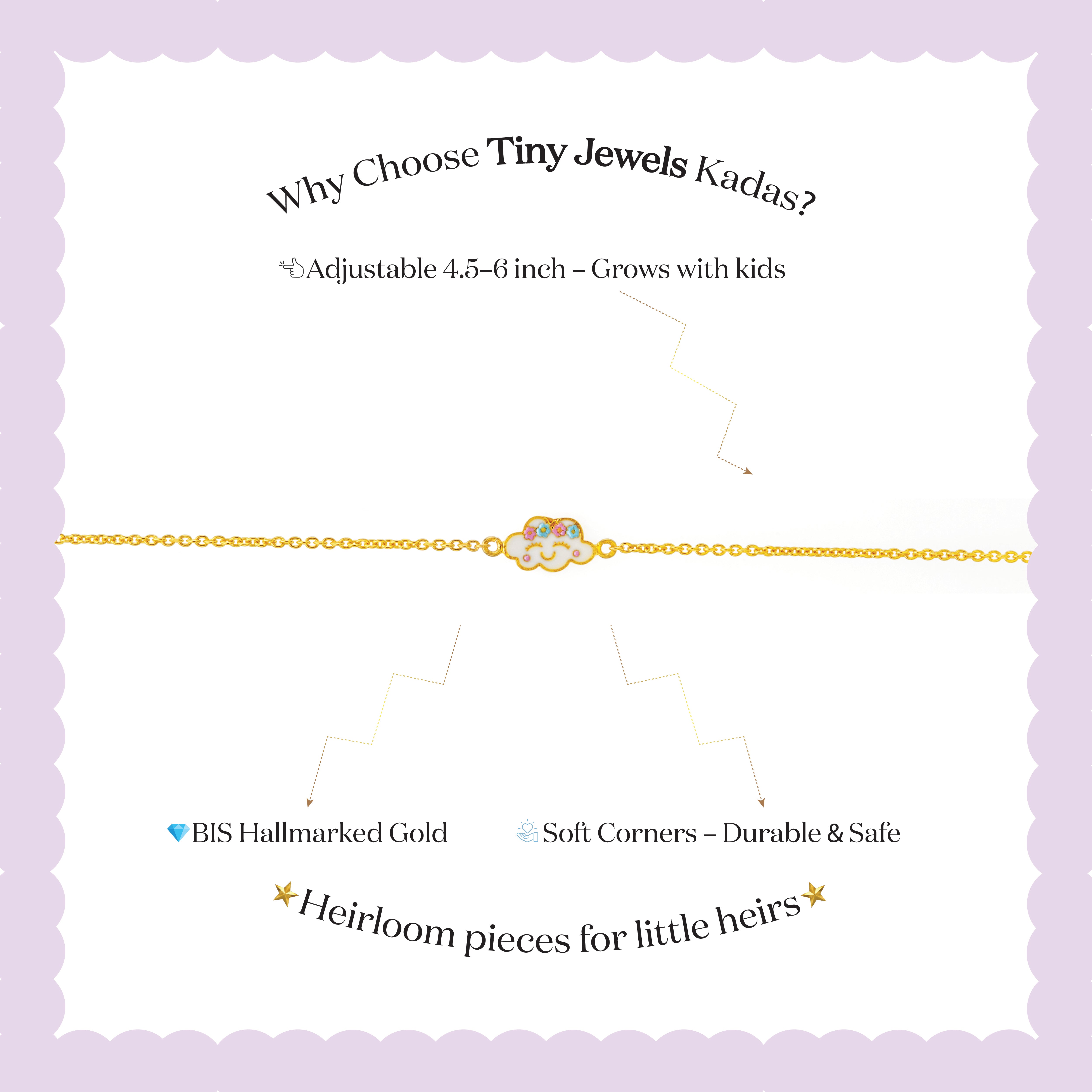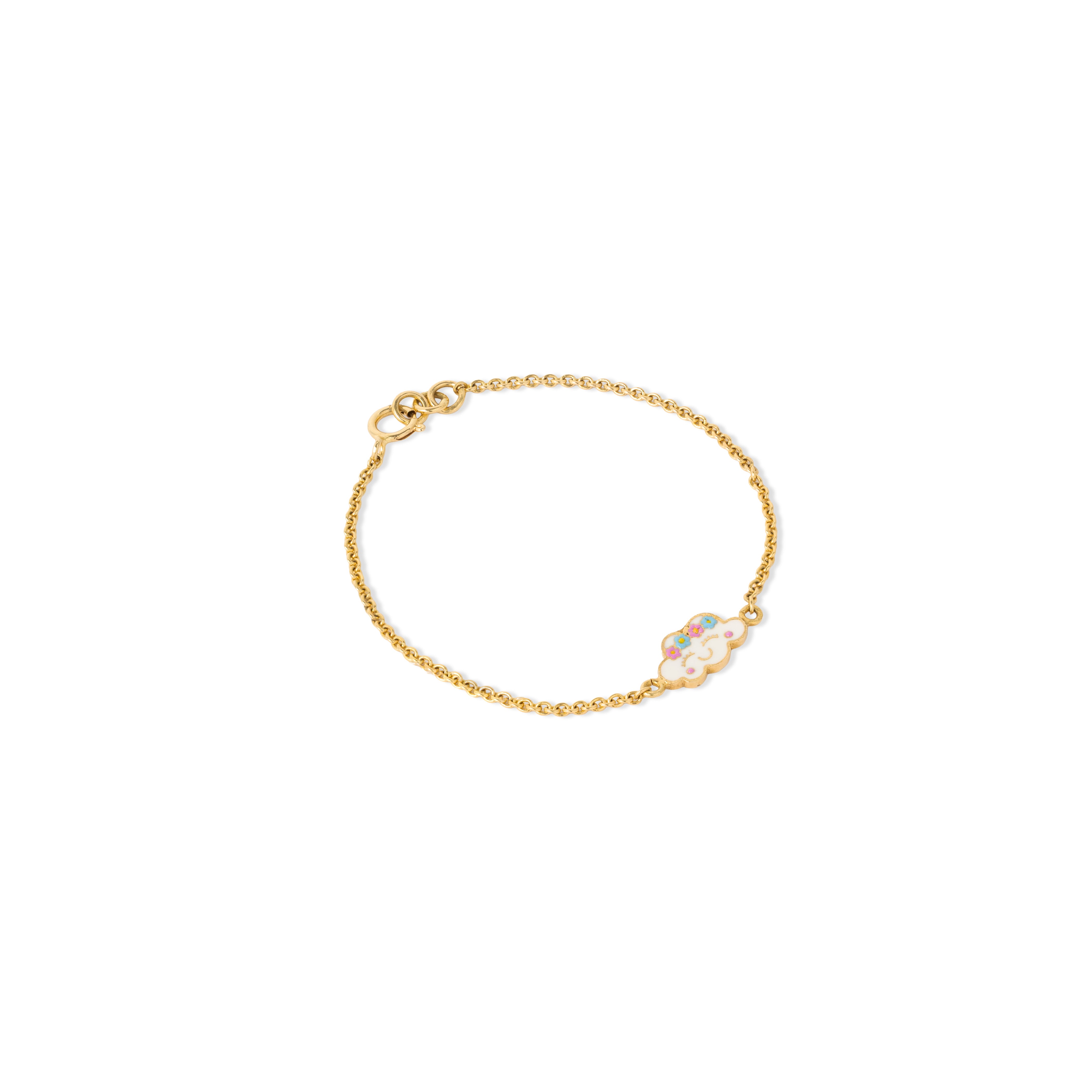 Float on softness with our Dream in Clouds Bracelet in solid gold. The cloud brings calm and peaceful vibes for gentle little dreamers. Made from hypoallergenic gold for carefree play, this bracelet takes your little one into the imaginative skies for adventure. Ready to see them soar high?