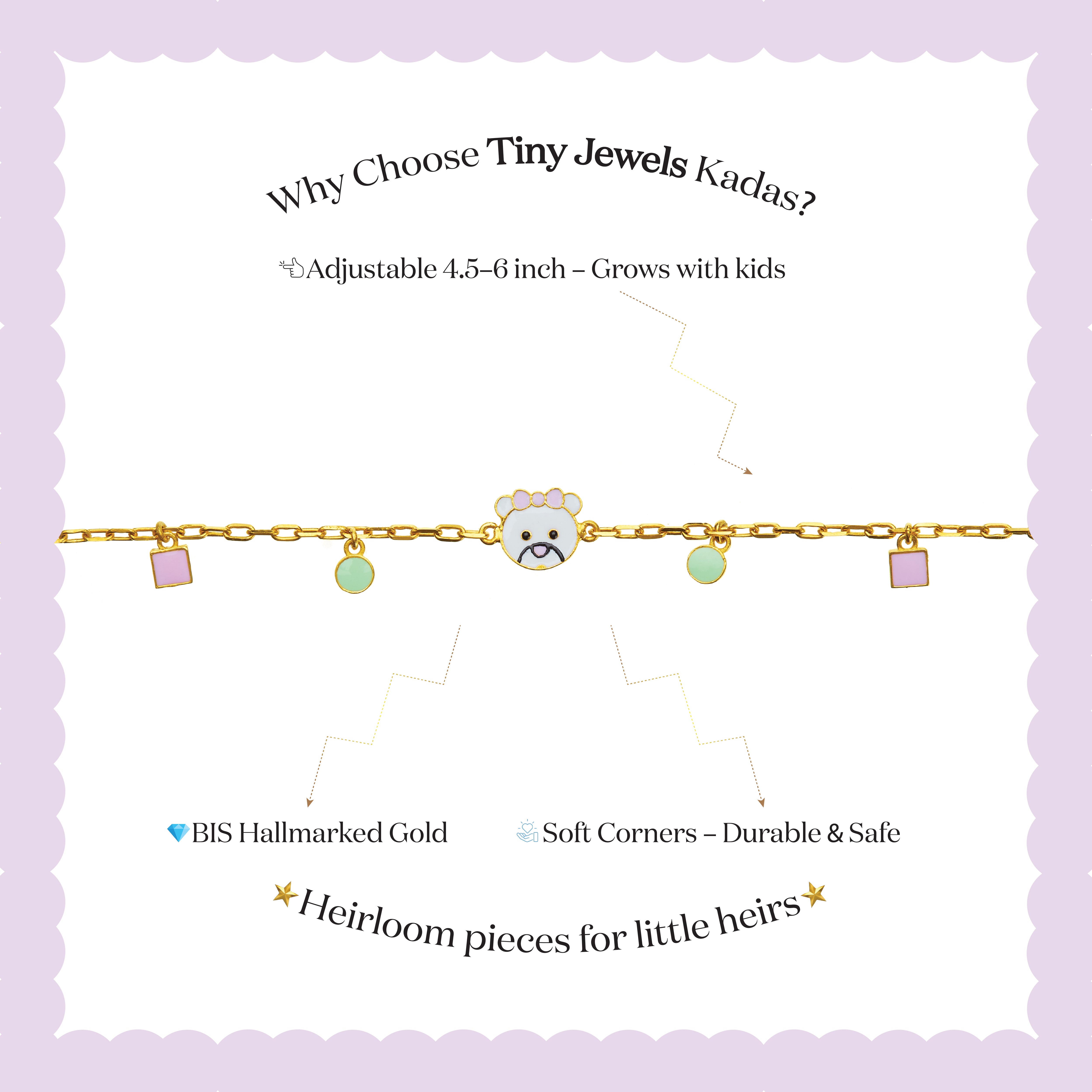 Get cozy with our Cuddly Charm Bracelet, featuring teddy faces and playful mini charms in solid gold. Hypoallergenic and cheerful, this bracelet is perfect for little comfort seekers! Give your little one a warm hug as you gift them this beautiful piece. Watch your child wear this and spread some love!