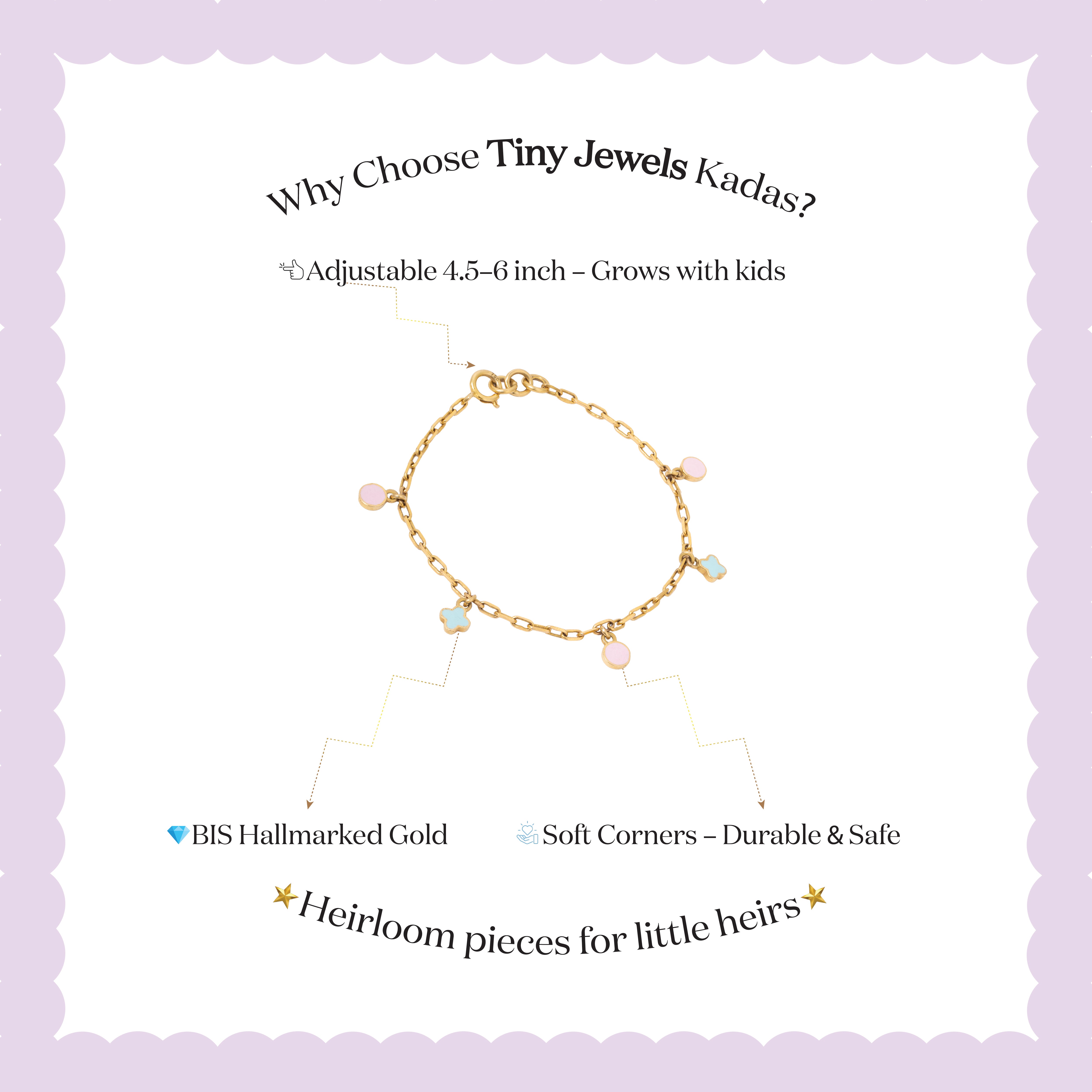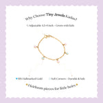 Add subtle sparkle with our Clovey Charm Bracelet, delicately crafted in solid gold. Mini circles and cloves bring a lucky touch to tiny wrists. This bracelet is made of hypoallergenic gold which ensures comfort through every giggle. Make everyday more special for your little one with a little bit of spine and sparkle.