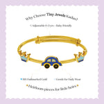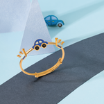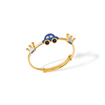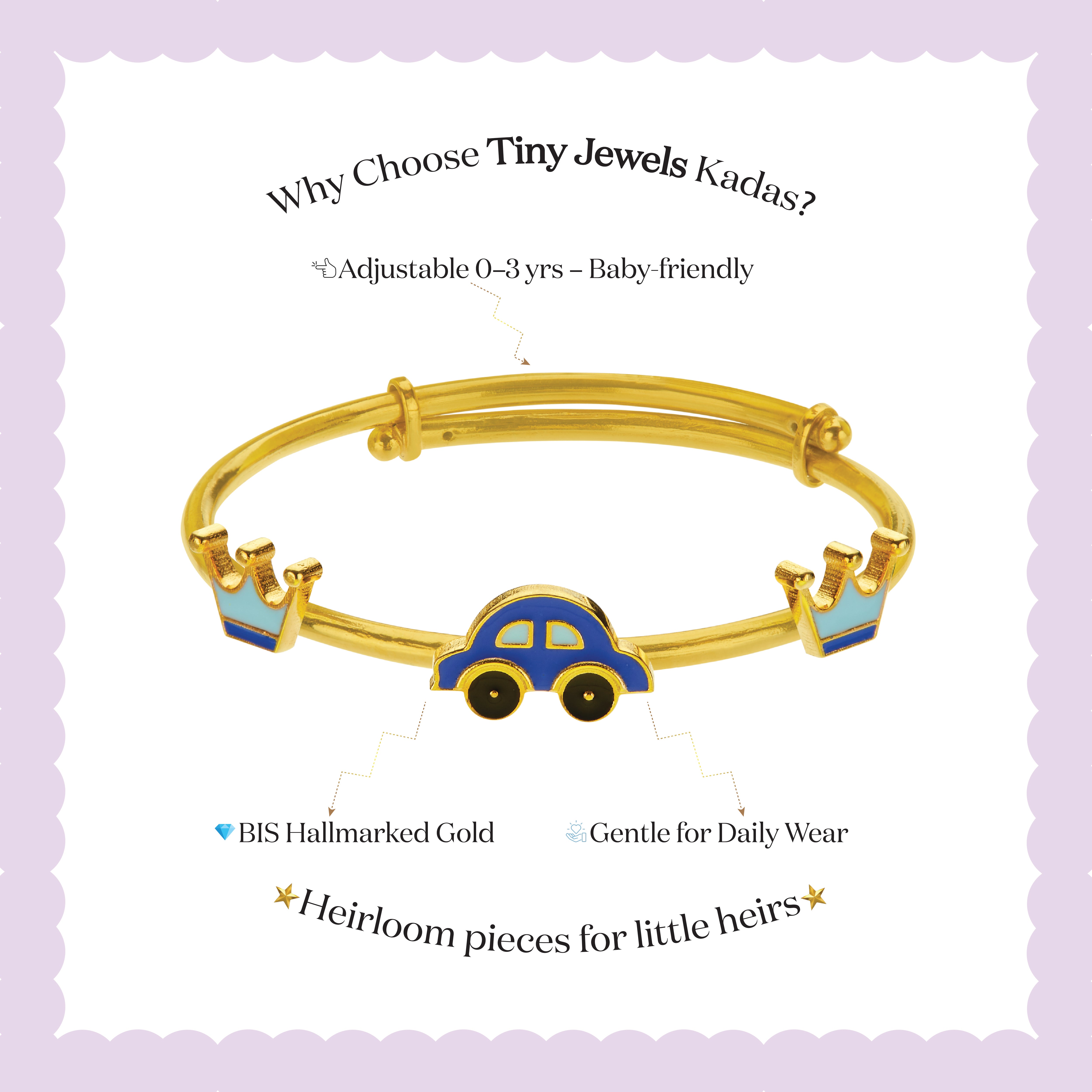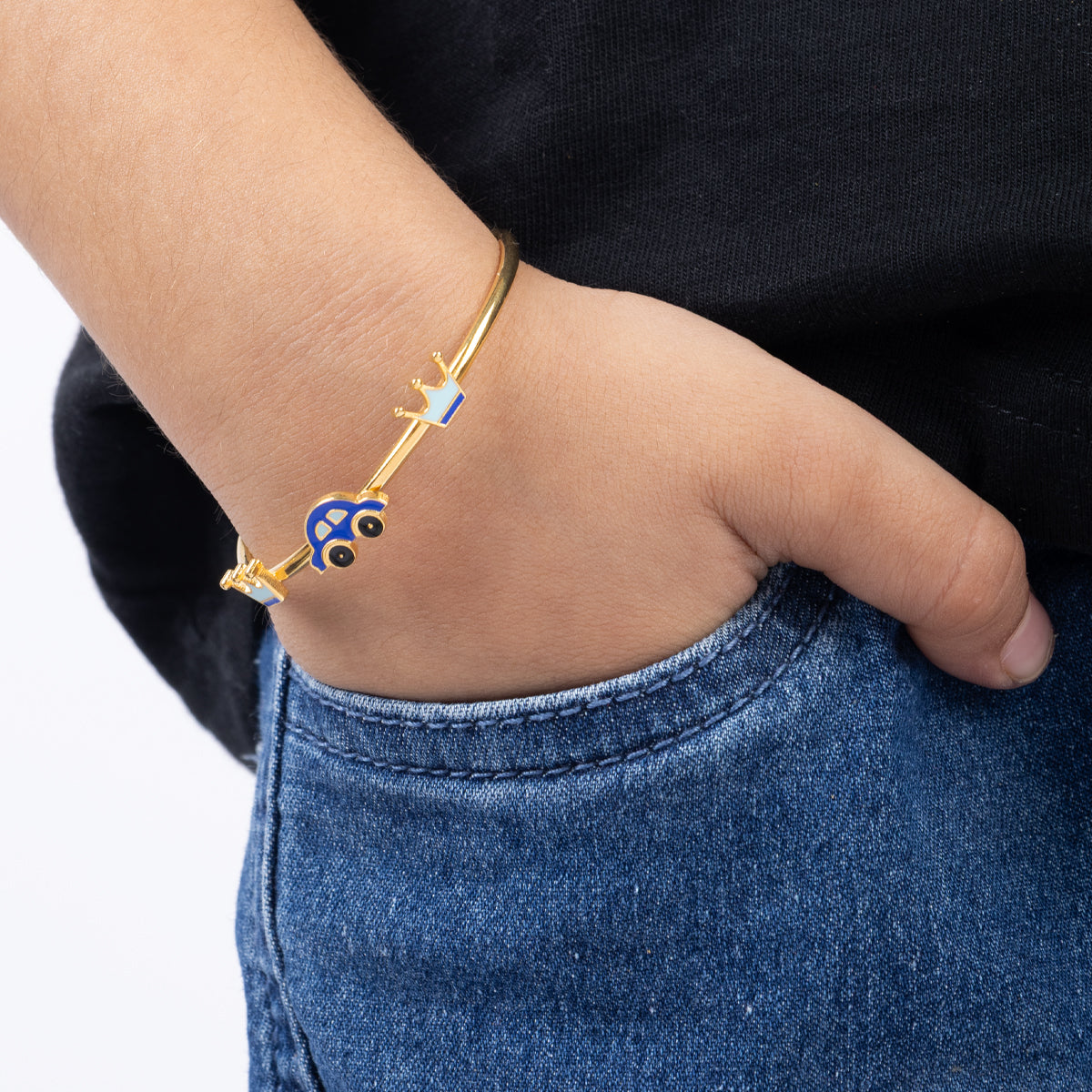 Celebrate the little royals in your house with our Royal Racer Kada in Solid gold. The bold navy blue car and blue crown charms bring a perfect mix of sporty fun and royal charm to every wrist. Made with durable and hypoallergenic gold, this kada feels gentle on delicate skin. It's designed for all-day comfort and made to last through every adventure and victory lap. Perfect for adventurous boys who love to rule their own playlands with courage and style. Ready to crown every victorious moment and race into joy?