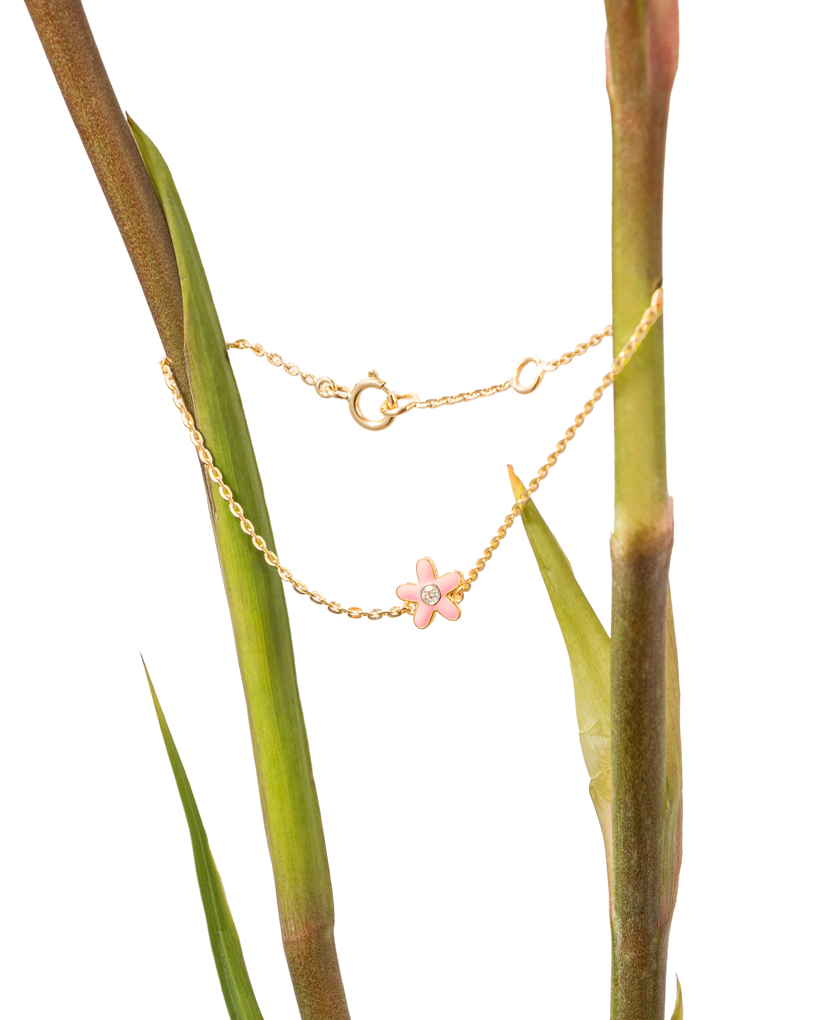A tiny blossom, a world of wonder! This Pop Bracelet features a single delicate flower with a sparkling diamond at its heart, crafted gently  for little wrists. A whimsical touch of magic that turns every tiny hand into a garden of joy.